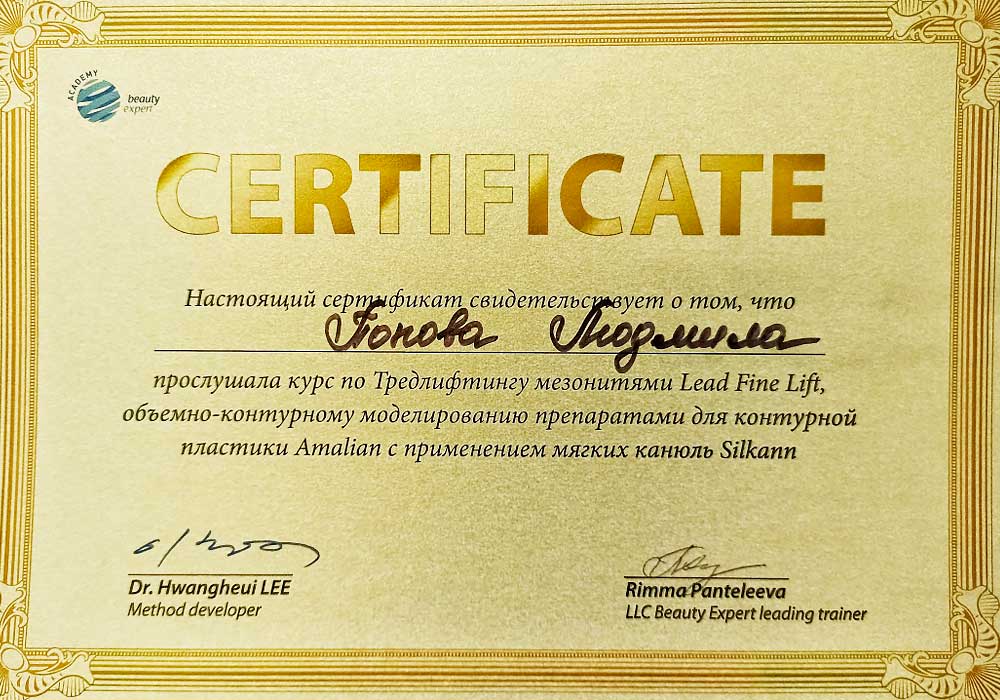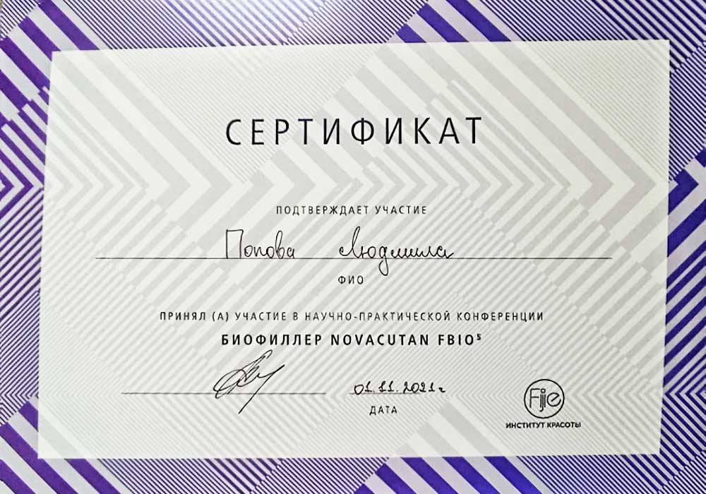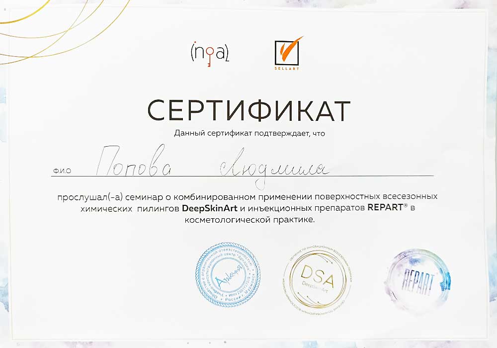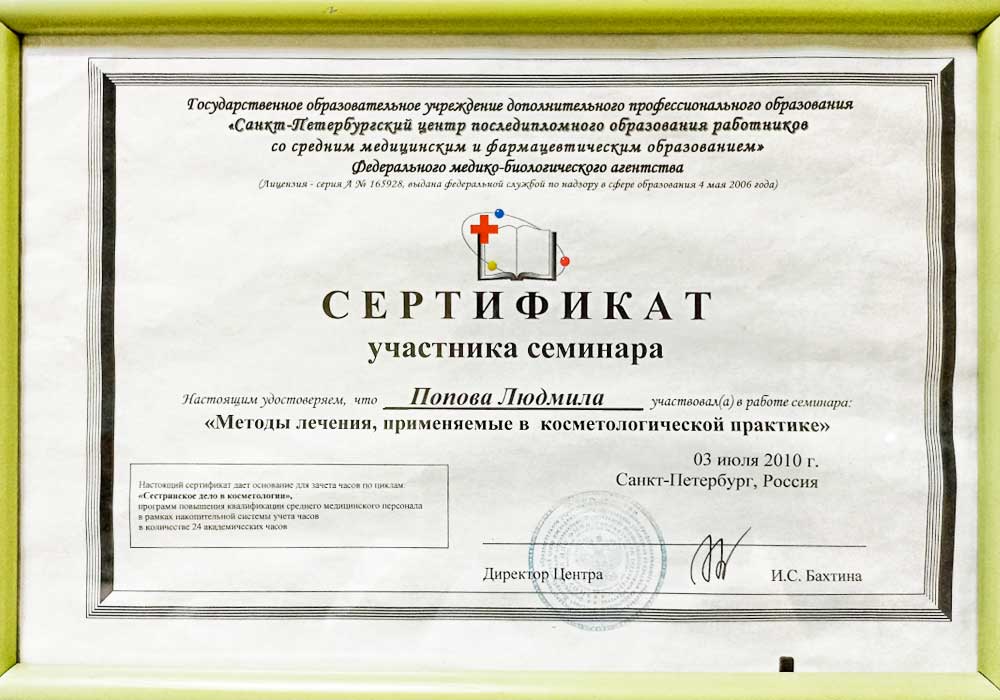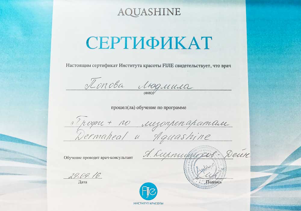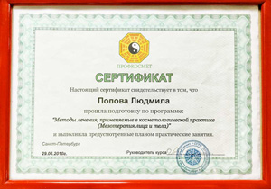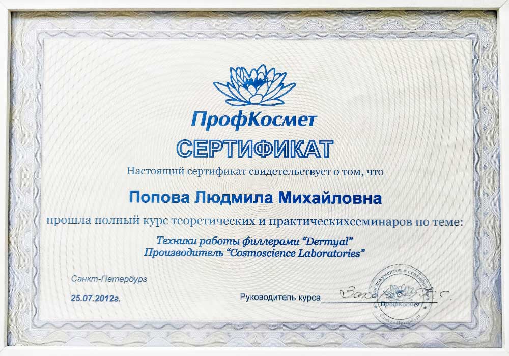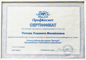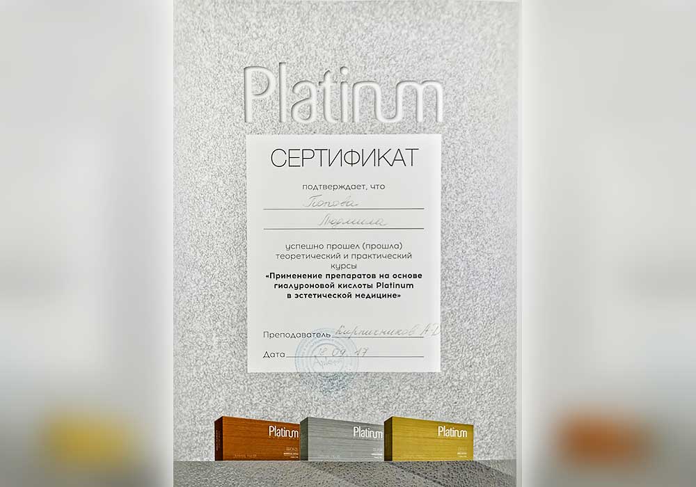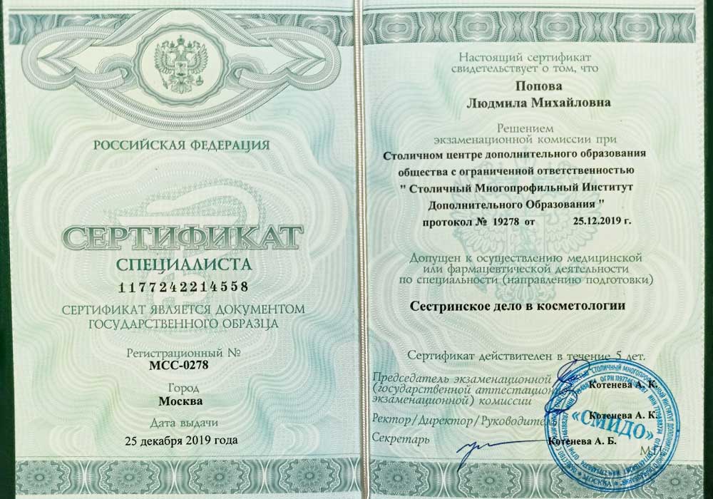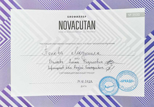 Имеет высшее медицинское образование. Специализация по косметологии подтверждена действующими сертификатами.