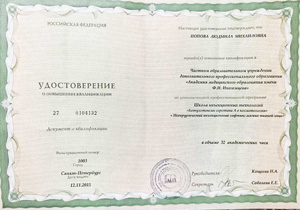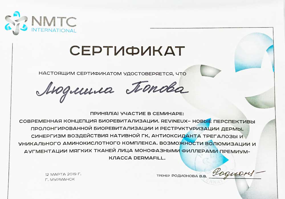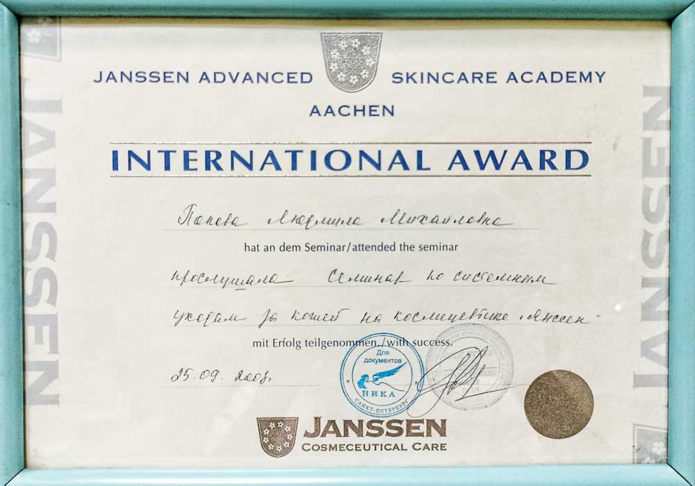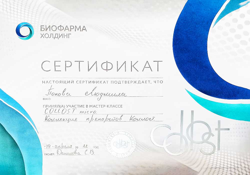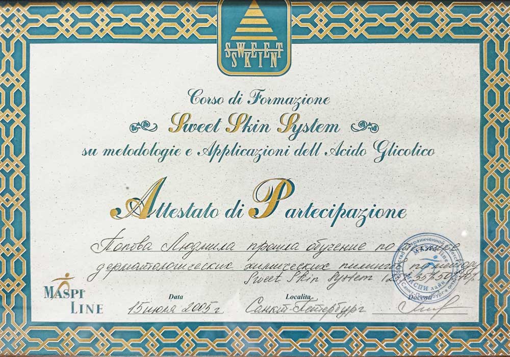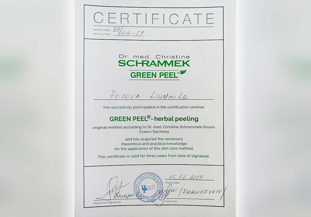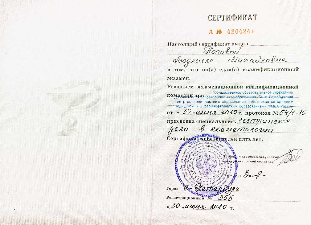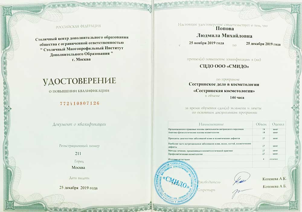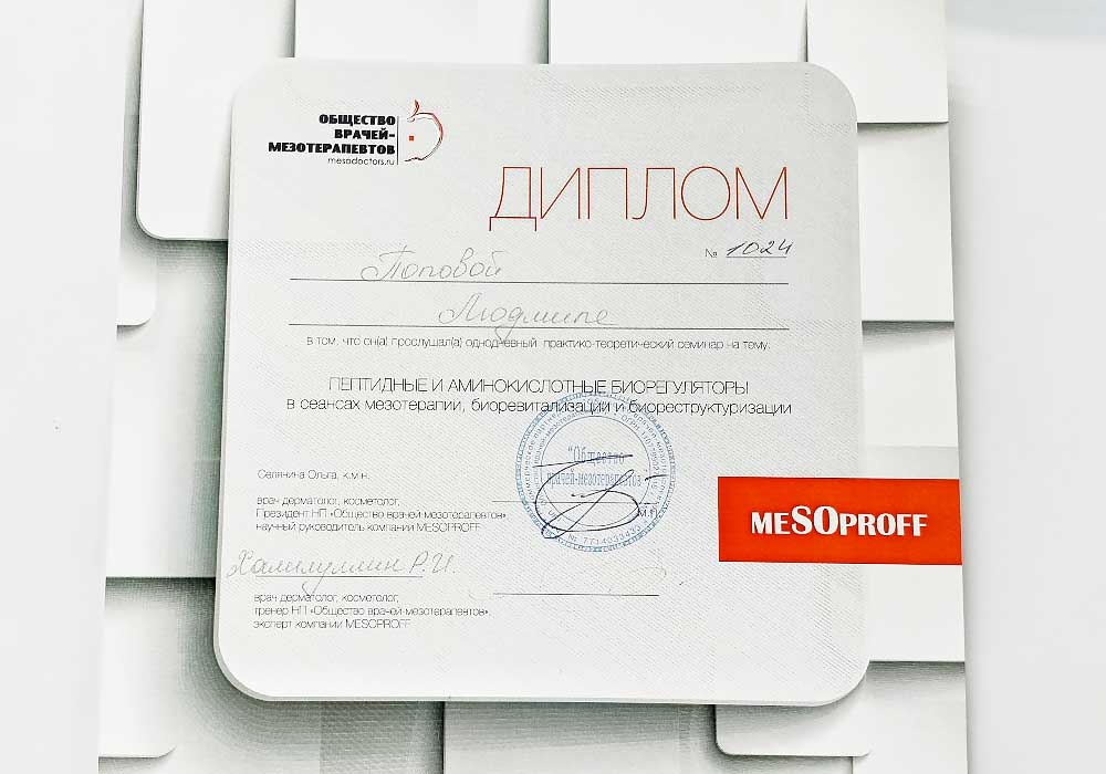 Имеет высшее медицинское образование. Специализация по косметологии подтверждена действующими сертификатами.